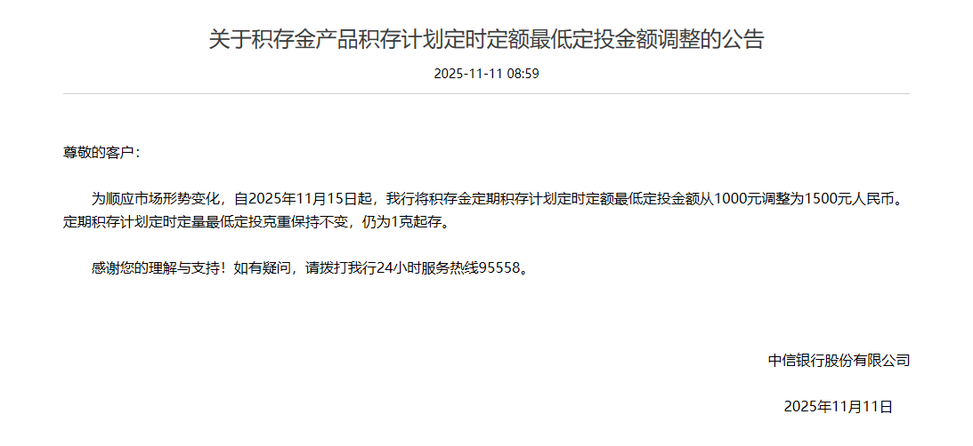 11月11日,中信银行发布关于调整积存金相关业务的公告