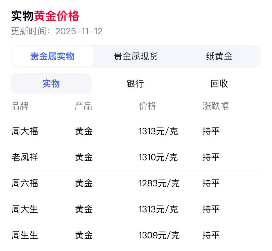 周大福、周大生克金1333元。周生生、老凤祥克金1326、1325元,均突破1300元。周六福1295元。