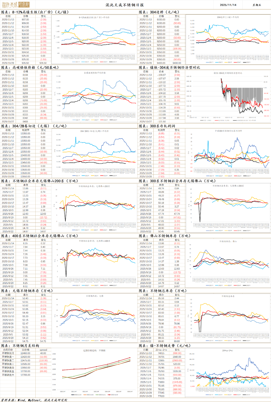 原料端,昨日印尼高镍生铁到港价-3至915.5元/镍点,当前镍铁现货供应充足,价格低位震荡。印尼目前暂停镍铁新建产能批准,短期影响有限。