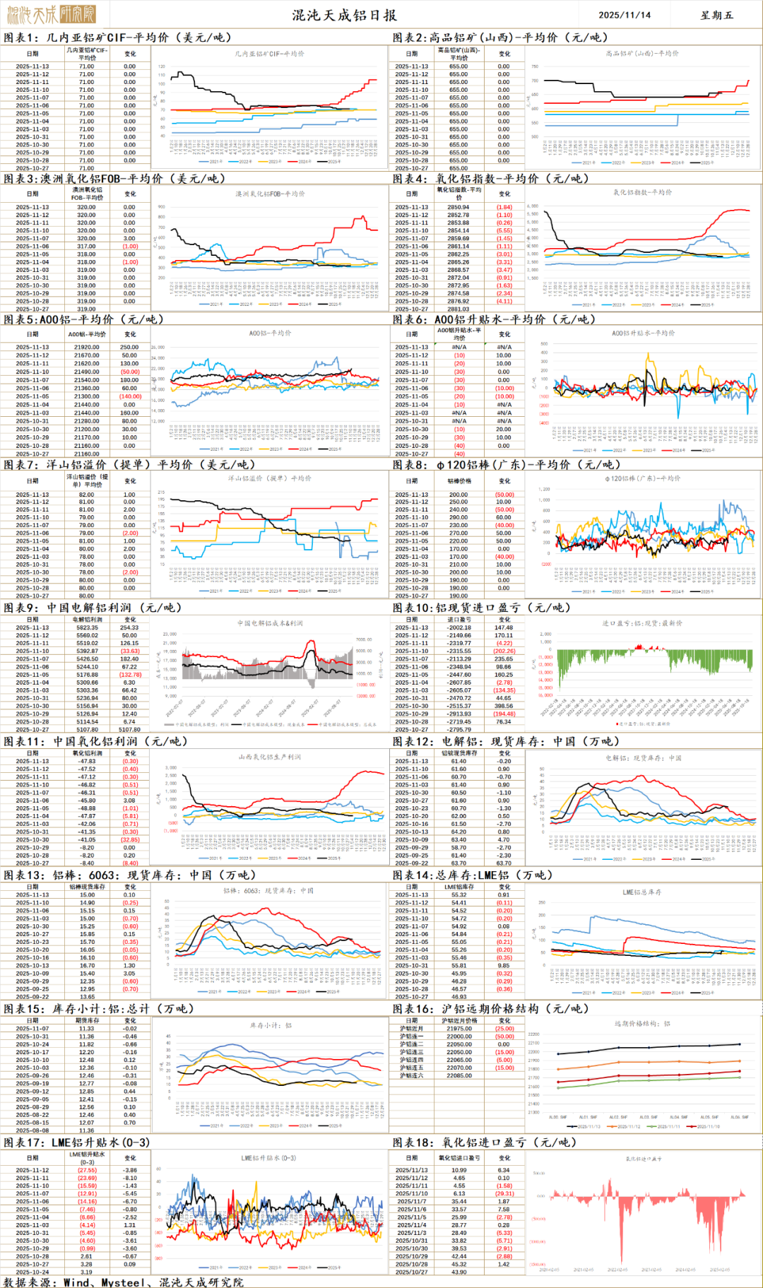 原料端,山西某氧化铝厂停产一条线,年化产能45万吨,减产预期有所兑现,几内亚矿端扰动再起,矿业部秘书长签署的一封信命令AGB2A-GIC和SD Mining公司在11月10日前从Axis Minerals原有开采许可证区域内撤出所有采矿设备,但从宁巴矿业开始运营和国内铝土矿库存数据来看,影响有限。进口矿供应仍有增量,成本侧无硬支撑,同时过剩严重下氧化铝现货难以给出期价共振上行的可能。进口窗口打开,国内氧化铝面临进口供应的压力,库存持续累库,基本面仍偏空。