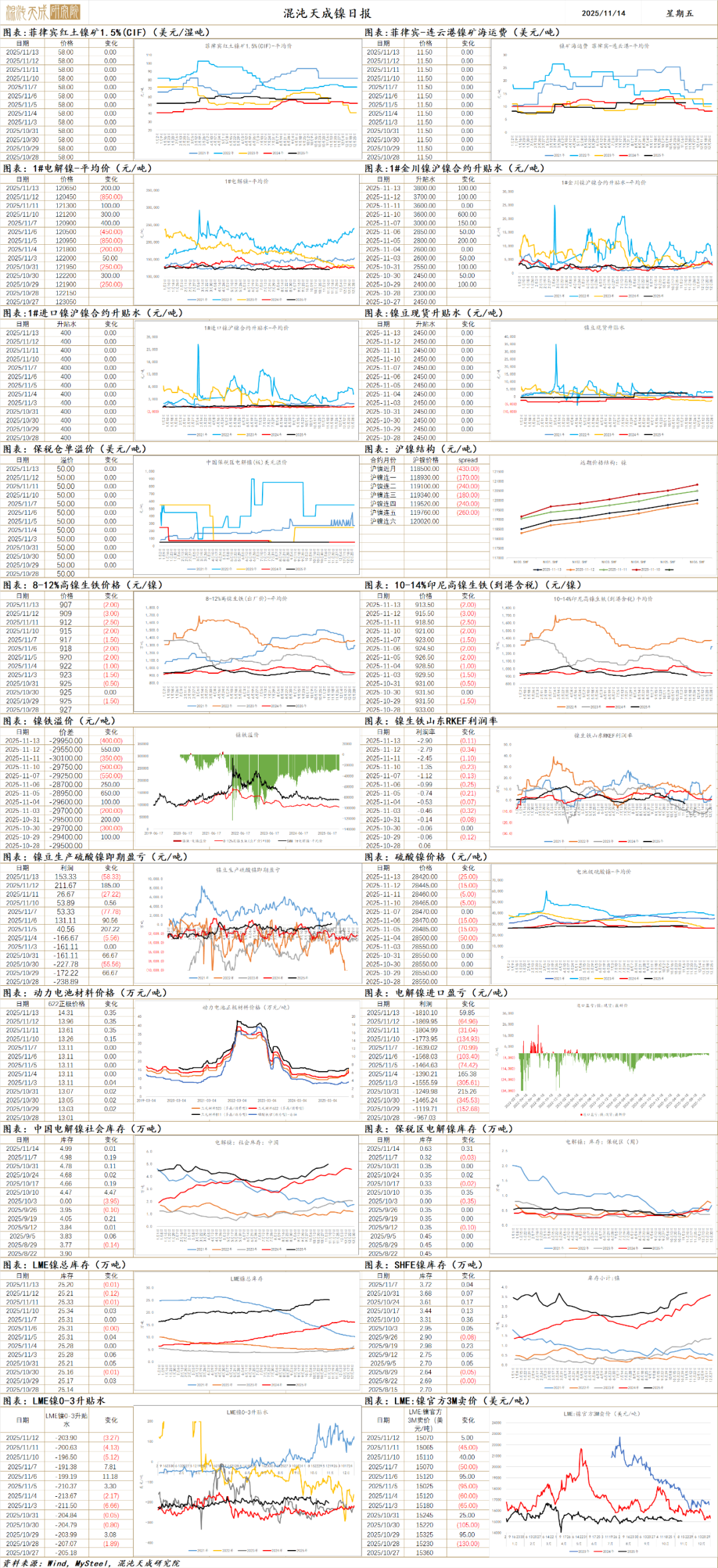 3、【PLS CEO呼吁政府合作助力供应链,警示锂价干预风险】澳大利亚锂矿企业PLS首席执行官DaleHenderson周三在巴西COP30气候峰会期间表示,各国政府间合作有望推动锂供应链发展,但价格干预需谨慎实施,否则可能扶持非优质项目。他同时呼吁各国政府加大对中国以外地区供应链的支持力度,通过政府间协作推进工业园区建设及贸易协议落地,加速新型供应链布局。(上海金属网)