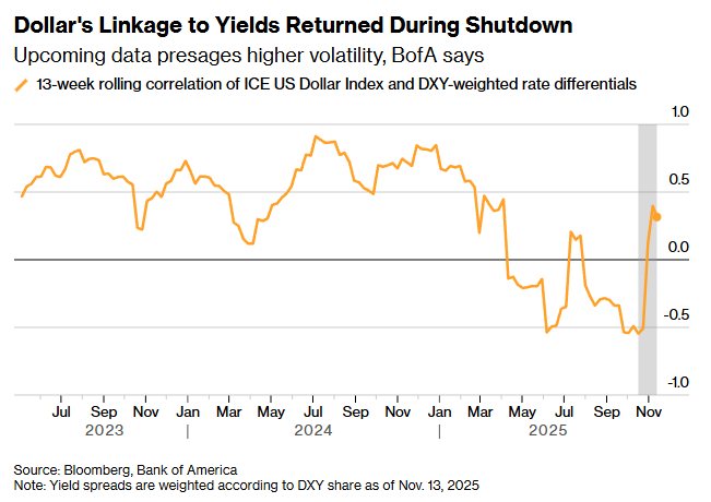 美国银行表示,随着创纪录的美国政府停摆结束、经济数据恢复发布——停摆43天堆积的数据将在未来三周一次性砸出,外汇市场的波动性预计将回归。美银策略师Adarsh Sinha和Janice Xue在周四的一份报告中表示,美元对全球利率的敏感度已升至今年第一季度以来的最高水平,他们援引ICE美元指数与两年期美债收益率利差之间的关系指出了这一点。