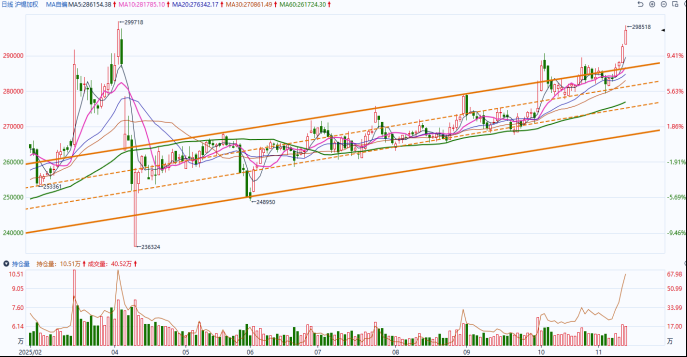 今年10月开始,沪锡价格涨势明显加快。并且11月10日以来,沪锡出现大幅拉升,截至目前SN2512涨幅约4.7%;同时沪锡加权持仓增加约3.4万手,持仓量接近2025年4月份水平,显示市场成交活跃度明显上升。