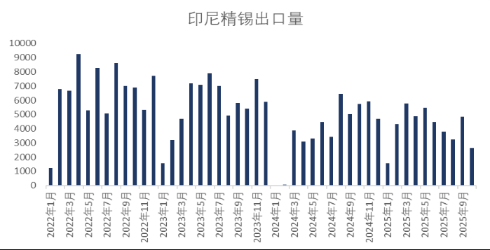 此前9月30日,印尼锡出口商协会预计2025年精炼锡出口量将达5.3万公吨,较上年的4.5万吨大幅增长18%。当时,印尼1-9月精炼锡累计出口3.8万吨,因此四季度存在约1.5万吨出口供应预期。而11月11日,印尼贸易部公布的数据显示,印尼10月份精炼锡出口量为 2643.05 公吨,比去年同期下降 53.89%。因此10月精炼锡出口反而出现大幅下降,缓解此前市场对供应增长的担忧。