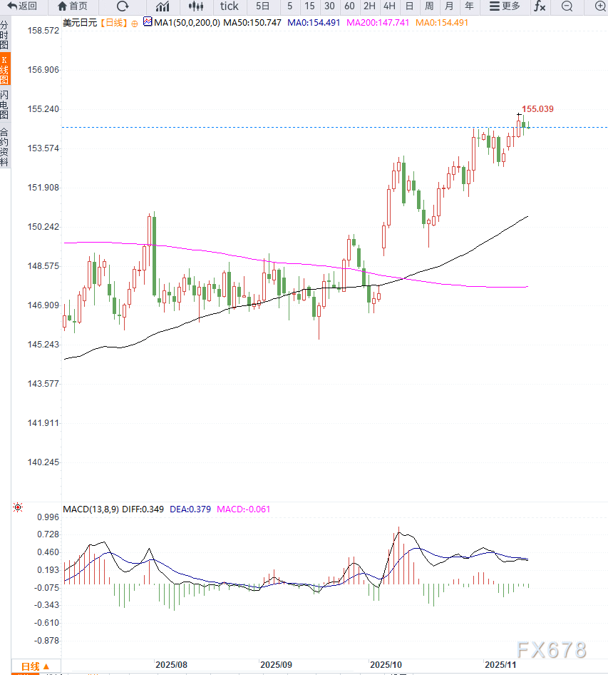 从技术结构来看,本周突破154.50的水平阻力被视为多头的重要触发点,动能指标仍维持在正区间,尚未触及超买区域。若价格有效突破155.00心理关口,则可能上探155.60,并进一步指向156.00整数关。