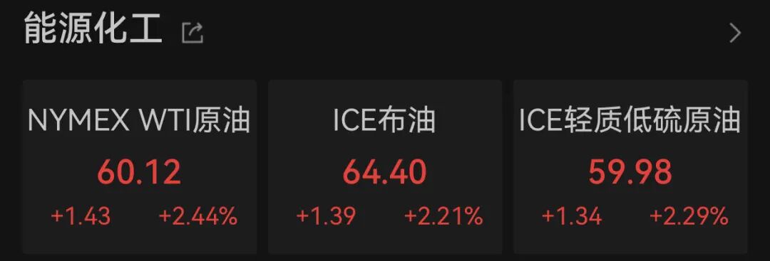 其他市场方面,国际油价大涨,截至发稿,NYMEX WTI原油、ICE布油均涨超2%。