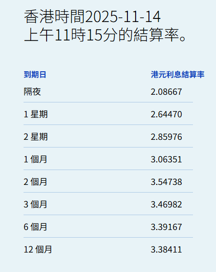 11月14日,港元拆息全线向下,隔夜息报2.08667%,跌44.881基点;一周拆息跌8.661基点,报2.6447%,两周则跌3.143基点,报2.85976%。与楼按相关的一个月拆息连跌两日,报3.06351%,跌3.405基点。