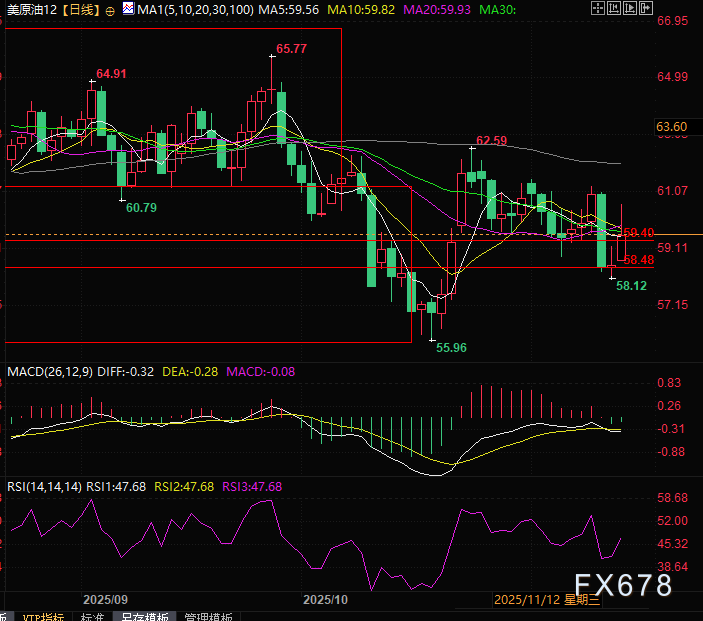北京时间16:00,美原油12月期货合约现报59.62美元/桶。
