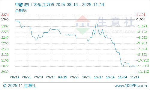 据生意社商品行情分析系统,11月10日至14日(截止15:00),国内甲醇市场华东港口报价自2058元/吨下跌至2034元/吨附近,周期内价格下跌1.17%,环比下跌10.16%,同比下跌17.82%。在高进口供应下,港口甲醇库存仍表现累积,对市场压制持续,港口甲醇市场维持低位震荡运行为主。