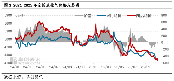 后市预测:预计11月国内液化气价格预计走势先强后弱,库存或前低后高。民用气方面,季节性降温有望带动刚性需求回暖,但市场供应充裕、进口成本偏低及上游库存压力仍存,卖方让利出货意愿较强,或持续压制价格反弹空间。醚后C4方面,短期市场供需基本面尚可,但油品需求进入淡季,深加工开工负荷偏低,叠加供应充裕,上游控库难度增大,市场缺乏利好支撑,价格预计先涨后跌为主。