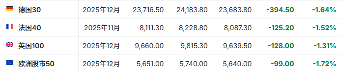 2.截至发稿,德国DAX指数跌1.64%,法国CAC40指数跌1.52%,英国富时100指数跌1.31%,欧洲斯托克50指数跌1.72%。