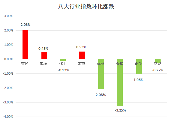 个行业,本周几乎全线上涨,上涨前三的分别是有色行业,涨幅为1.88%,能源行业,涨幅为0.61%,化工行业,涨幅为0.53%。