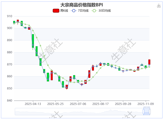 11月14日大宗商品价格指数BPI为875点,较周初上升了534.85%,3.06%。
