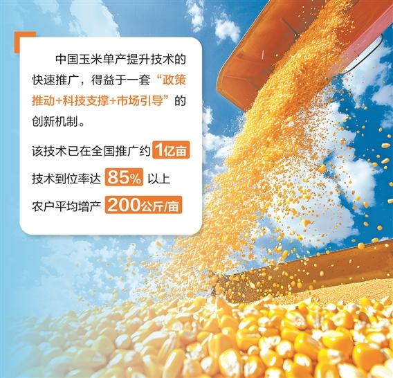 中国玉米单产提升技术的快速推广,得益于一套“政策推动+科技支撑+市场引导”的创新机制。据介绍,该技术已在全国推广约1亿亩,技术到位率达85%以上,农户平均增产200公斤/亩。