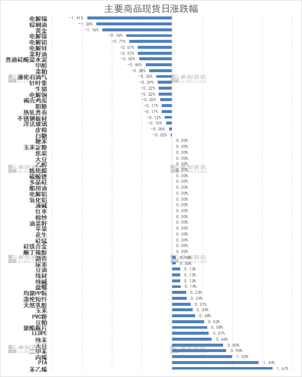 11月17日,卓创资讯监测商品现货市场20种上涨、20种下跌,22种企稳。能源化工板块苯乙烯涨1.67%、PTA涨1.44%领涨,甲醇、液化石油气下跌,板块强弱分化;有色金属板块电解锡跌1.41%领跌,电解镍、电解铅、电解锌等下跌,整体表现弱势;农产品板块豆粕、玉米、豆油上涨,棕榈油、菜籽油、菜粕下跌,分化明显;黑色板块不锈钢板材、热轧普卷下跌,板块表现弱势。(价格涨跌幅均以卓创资讯监测现货商品均价或主流市场价格计算)