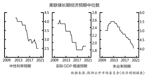 在此背景下,美联储对中长期经济的预期持续下调,与2012年相比,其在2020年对未来经济发展态势的认知已发生显著变化。一是经济潜在增长率预估大幅下调。受人口增长放缓、人口老龄化加剧及生产率增速下降等因素影响,FOMC对经济潜在增长率的估计中值从2012年的2.5%,降至2020年的1.8%。二是自然失业率预估显著下降。由于美国菲利普斯曲线呈现扁平化特征(菲利普斯曲线反映的是失业率与通胀率之间关系,失业率下降时通胀率不再同步上升,两者负相关关系弱化,曲线走平),FOMC对自然失业率估计值的中值从2012年的5.5%降至2020年的4.1%。三是中性联邦基金利率预估大幅走低。FOMC对中性联邦基金利率估计值的中值从2012年初的4.25%降至2020年的2.5%,整体利率水平持续接近ELB,美联储判断ELB约束可能成为反复出现的问题。正是基于上述认知,美联储对货币政策框架作出调整。(见图)