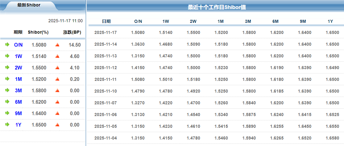 【大河财立方消息】11月17日,上海银行间同业拆放利率(Shibor)短端产品全线上行,其中隔夜产品大涨14.5BP,报1.508%;14天产品报1.550%,与1月期产品(1.520%)形成倒挂。