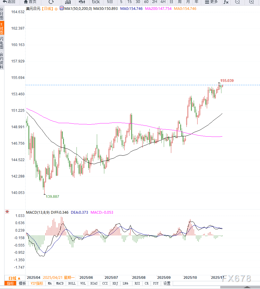 在外部环境方面,美元虽然因美国政府长期停摆后出现的数据延迟而缺乏明显优势,但日元的弱势更为突出,使USD/JPY维持在154.00–155.00区间上方。不过,日元空头不敢过度激进。