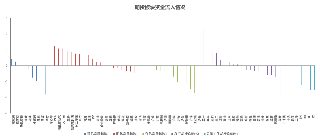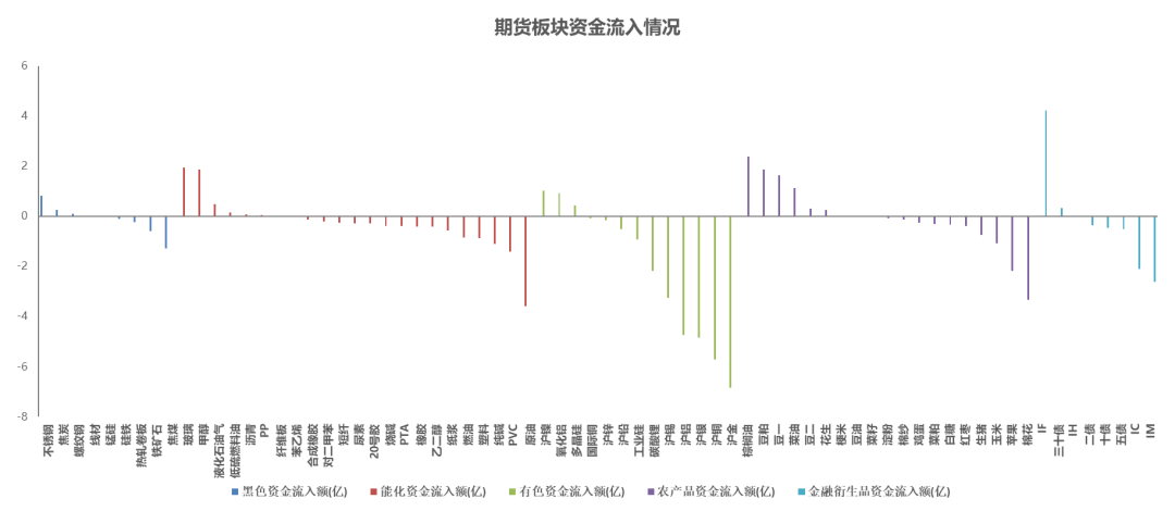 从板块资金流动情况来看,农产品部分流入,有色、贵金属多数流出。