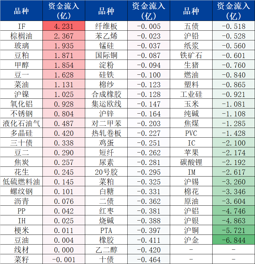 资金流入前三名为IF、棕榈油和玻璃;流出前三名分别为沪金、沪铜和沪银。