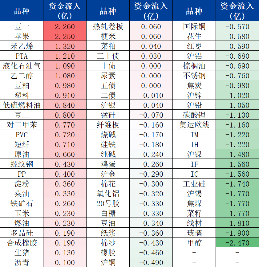 涨幅居前的三个品种分别是豆一、苹果和苯乙烯;跌幅居前的是甲醇、玻璃和线材。