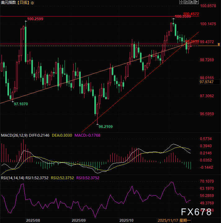 汇通财经APP讯——周一(11月17日),受美联储降息押注概率的下降,美元指数迎来连续两日的小幅反弹,目前交投于99.30附近,美联储内部意见分化与通胀粘性的双重制约,正不断推迟降息落地时点,原本市场期待的2025年12月第三次降息如今悬念迭起,多数观点认为下次降息大概率要延后至2026年。通胀居高不下、经济数据混沌以及内部分歧扩大,共同将未来数周推向美联储货币政策的关键拐点。