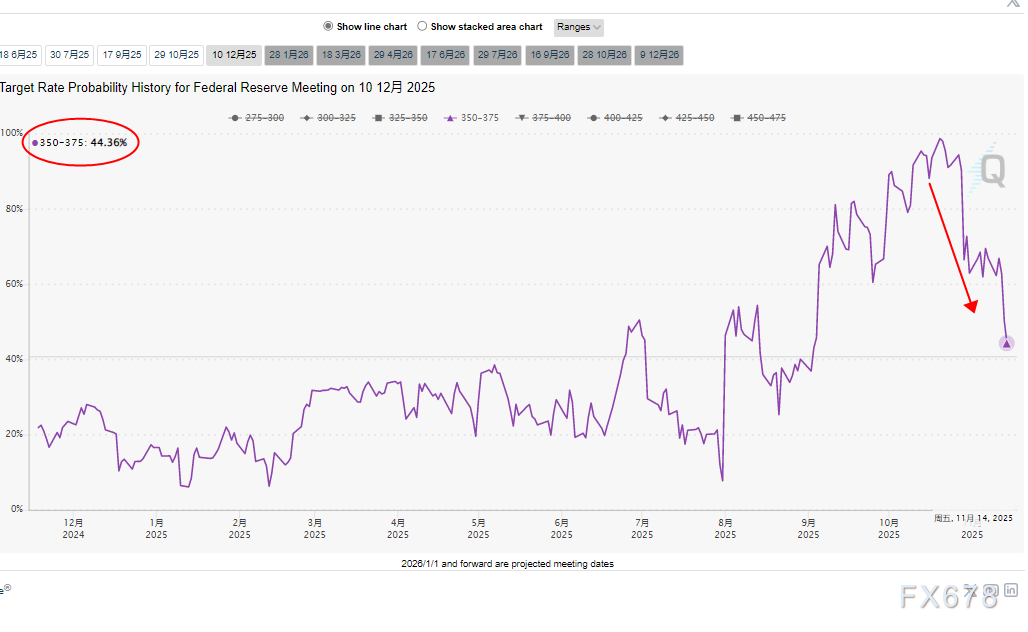 芝加哥商品交易所(CME)美联储观察工具显示,11月14日12月降息概率已降至44.4%,后续更是进一步变化,上周五短期利率期货数据显示,12月暂停降息的概率已升至60%。
