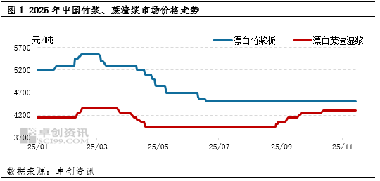 2025年1-11月中国竹浆、蔗渣浆价格走势整体一致,多数时间跟随进口木浆价格变化,另因各自基本面表现不一,部分阶段走势略有差异。临近2025年收官,市场多空消息共存,竹浆、蔗渣浆价格走势或分化后一致。