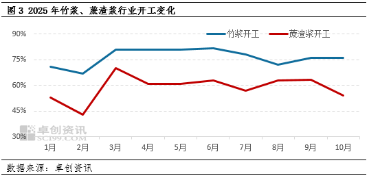 2025年至今中国竹浆、蔗渣浆价格走势先一致、再分歧后趋同。一季度,在春节需求由强转弱、进口木浆现货价格先涨后跌等因素影响下,竹浆、蔗渣浆先涨后跌;二季度,步入需求淡季,叠加进口木浆外盘、现货价格下跌,竹浆、蔗渣浆跌至年内低点后企稳;三季度,受市场供需变化以及进口针叶浆、阔叶浆走势差异影响,竹浆、蔗渣浆走势由同步转为差异化;10月中旬后竹浆、蔗渣浆价格走势由分化趋于一致。截至11月14日,漂白竹浆板日均价4500元/吨,较年初跌幅13.46%,漂白蔗渣湿浆日均价4300元/吨,较年初涨幅3.61%。