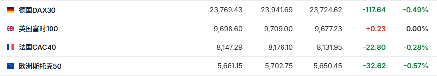 2. 截至发稿,德国DAX指数跌0.49%,英国富时100指数涨0.00%,法国CAC40指数跌0.28%,欧洲斯托克50指数跌0.57%。