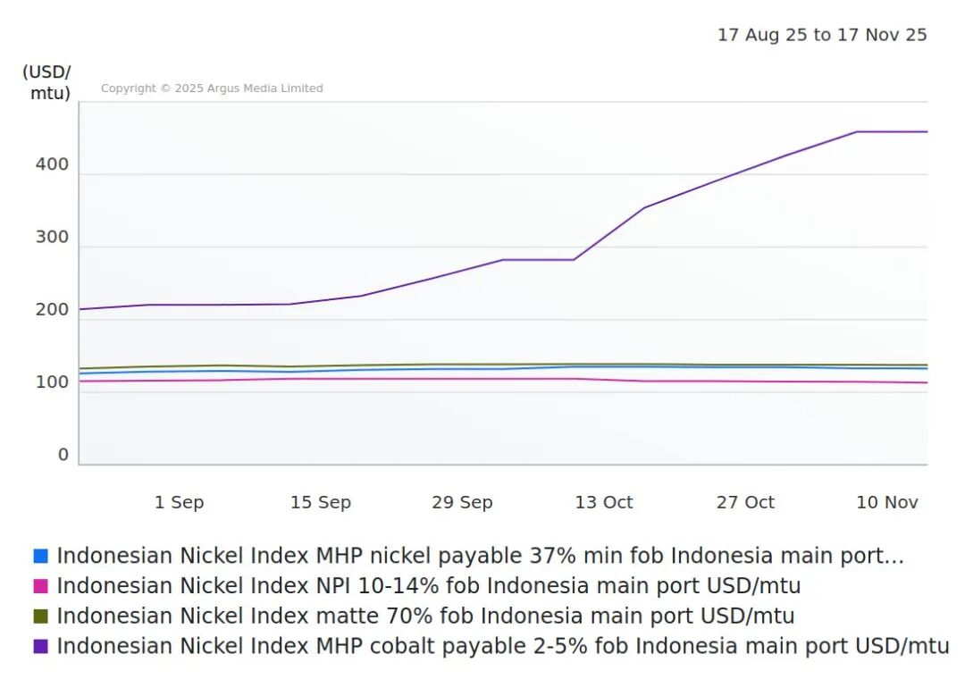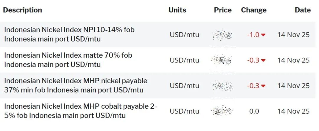阿格斯印尼镍指数(简称INI指数)包含不同品位的二级镍和中间品的周度价格评估,即基于fob印尼的: