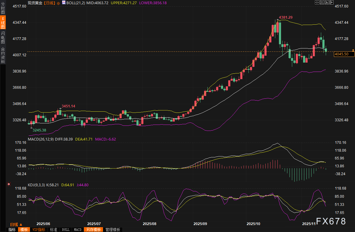 汇通财经APP讯——周一(11月17日)现货黄金一度暴跌近2%,最低触及4006.80美元/盎司,收盘勉强守在4045美元附近。罪魁祸首只有一个:美联储就12月降息预期进一步降温,美元指数强势反弹0.25%,报99.54。美元一涨,以美元计价的黄金对全球其他货币持有者立刻变得更贵,买盘自然大幅缩水。High Ridge Futures金属交易主管David Meger指出:“降息预期被大幅下调,黄金的乐观情绪正在迅速消退。”