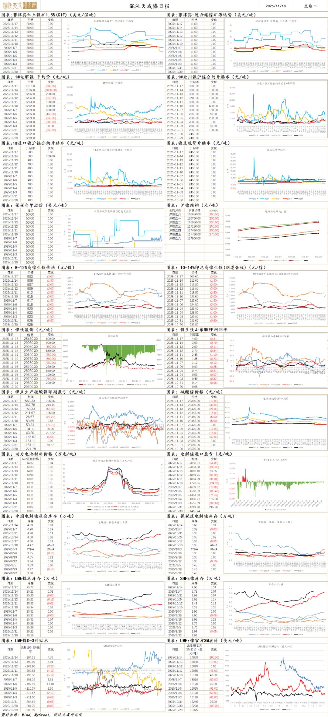2、【过剩格局维持 中国精炼镍社会库存显著累库】据Mysteel调研统计,截止2025年11月14日,中国精炼镇27库社会库存增加3563吨至54243吨,增幅7.03%;仓单库存增加2393吨至35027吨;现货库存增加170吨至15446吨,其中镍板增加1170吨,镍豆持平;保税区库存持平至3770吨。近期因硫酸镍利润空间相对精炼镍更具优势,国内部分精炼镍生产厂商有减产精炼镍、将产能转移至硫酸镍,但精炼镍产量仍维持高位,社会库存大幅累库。(Mysteel)