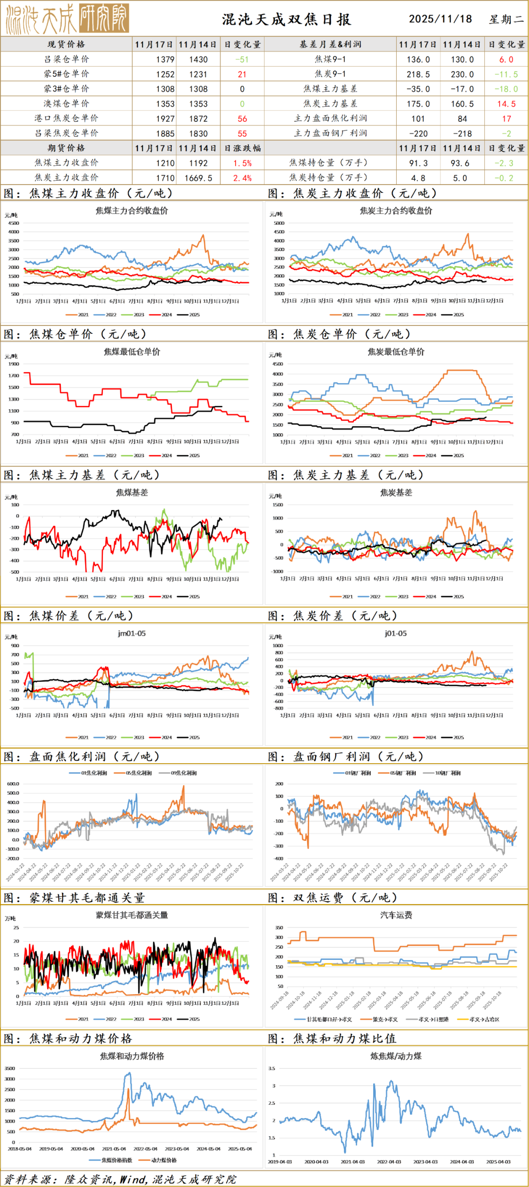 2.中国煤炭资源网冶金部11月17日重点关注:焦炭部分,焦炭第四轮提涨全面落地,累计涨幅为200-220元/吨。焦炭落实本轮涨价后亏损压力有所缓解,并且前期因环保限产的焦企陆续提产,焦炭产量稳中有增。需求方面,当前华北区域多数钢厂现金流利润尚可,暂无主动减产计划,刚需仍存,对原料继续维持按需采购策略,焦炭社会库存不高,目前仍呈供需偏紧状态。不过随着原料煤价格开始回调,成本支撑转弱,短期焦价涨跌两难,后期重点关注高炉铁水变量以及煤价走势。焦煤方面,产地煤矿多维持前期生产节奏,生产恢复缓慢,供应端仍显紧张。需求方面,下游焦企目前按需采购,贸易商积极出货兑现利润,炼焦煤成交氛围转弱,线上竞拍流拍率增加,不过煤矿由于库存低位,价格基本维持前期报价,市场整体偏稳运行,后期关注煤矿供应情况和下游钢厂生产情况。进口蒙煤方面,甘其毛都口岸通关延续高位运行的,单日通关维持在1300车附近。近几日随着期货盘面下跌,口岸蒙煤价格转弱,目前蒙5原煤报价降至1080-1130元/吨左右。