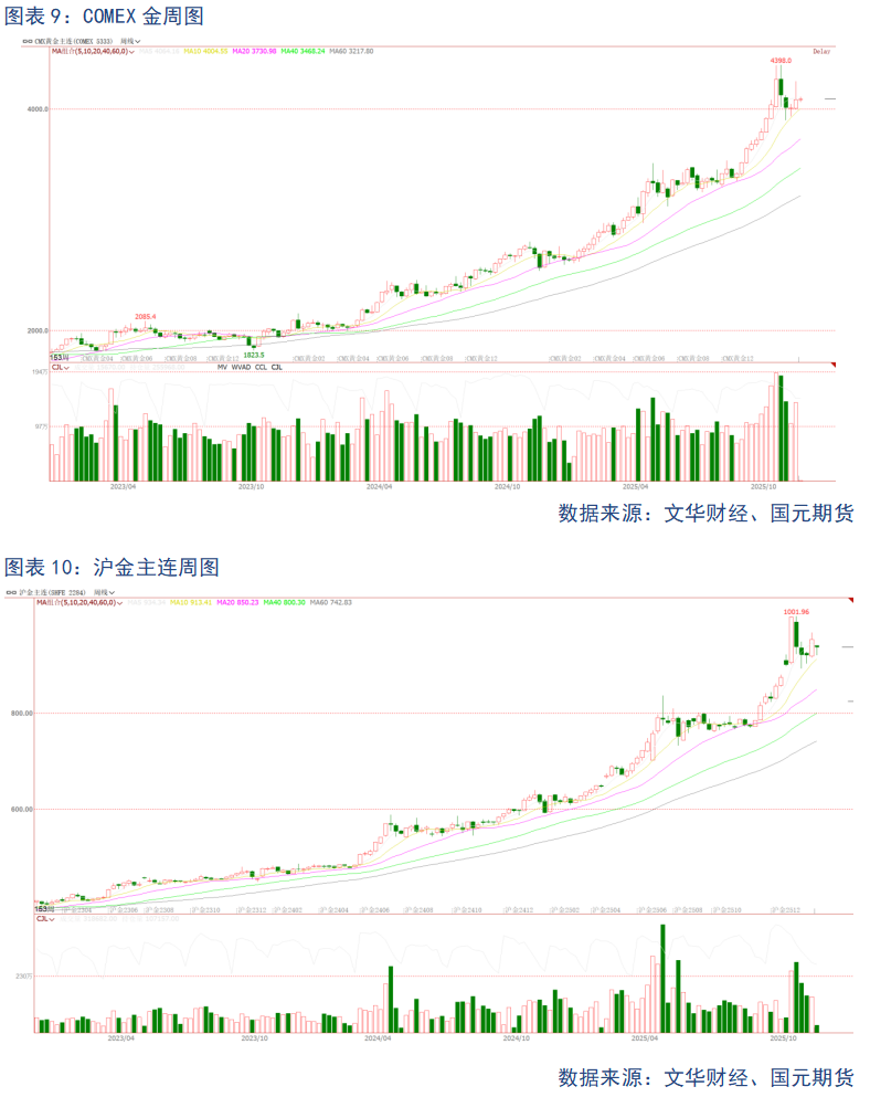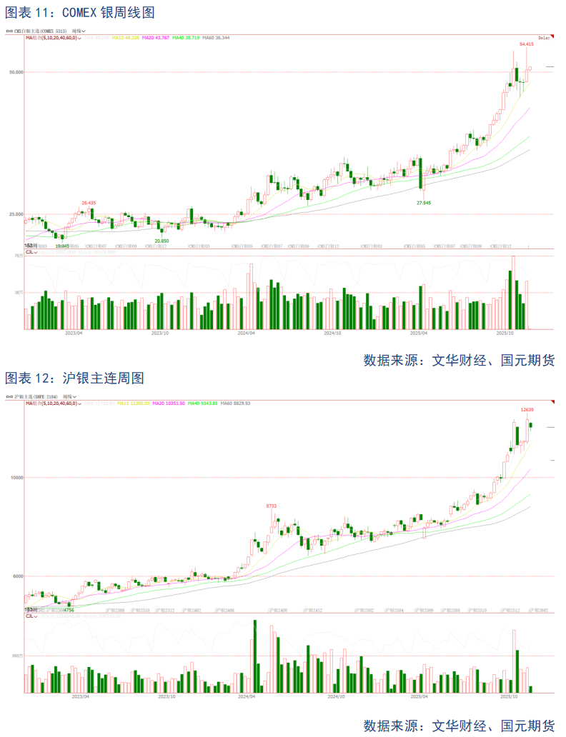 从技术面来看,黄金与白银均呈现强劲的上升趋势。黄金方面,COMEX黄金和沪金主力周线均线呈多头排列,短期均线向上发散且对价格支撑有力,多头量能显著放大,价格不断突破前期高点,形成清晰上升趋势通道,未见顶背离等见顶信号。白银方面,COMEX白银和沪银主力周线同样均线多头排列,短期均线支撑价格阶梯式上涨,多头量能持续释放,价格突破震荡区间后回调幅度有限且快速收复,缺乏空头信号。综上,黄金和白银整体均处于上升趋势,后续大概率延续多头行情。