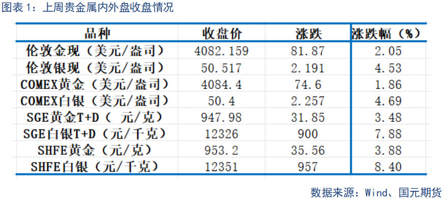 本周贵金属市场相对持稳,外盘伦敦金银分别涨2.05%和4.53%,COMEX金银涨1.86%和4.69%;内盘SGE金银T+D分别涨3.48%和7.88%,SHFE金银涨3.88%和8.40%,市场整体看多情绪较浓。