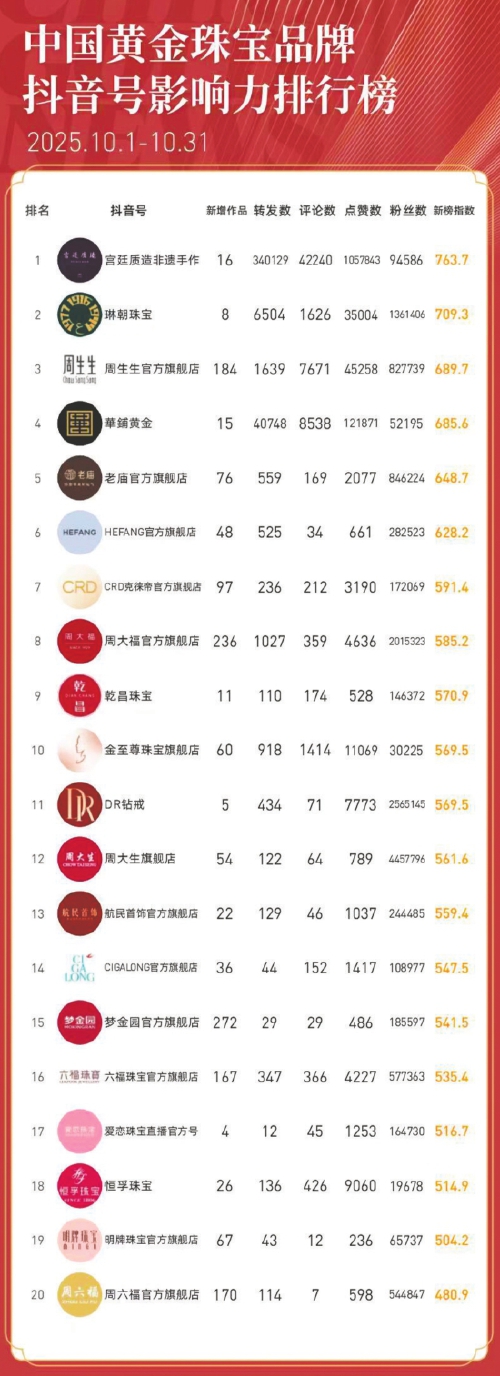 10月,榜单迎来新一轮洗牌。专注“非遗手工金器”的宫廷质造非遗手作以763.7的新榜指数强势登顶,终结了琳朝珠宝连续9个月的领跑局面,印证了行业“文化价值驱动流量”的全新增长路径。