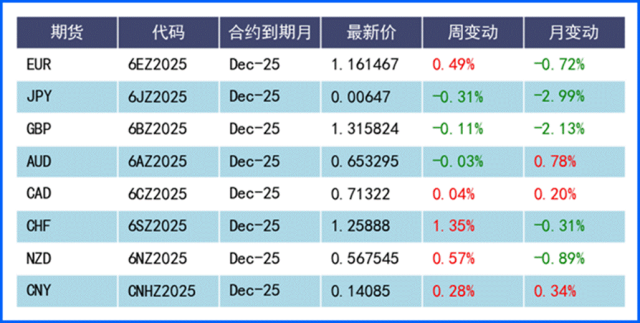 美元兑日元上周再度走高,并于周五在九个月高位处窄幅震荡。日本高层强调维持宽松金融环境,压制了短期内的加息预期,目前市场预计12月加息概率约24%、明年1月约46%。但同时日本财政与经济部门言论警示,又引发市场对汇率干预担忧,限制了日元空头力量。日本央行认为消费动能改善、核心物价趋近目标,部分观点称通胀达标或推动未来数月加息