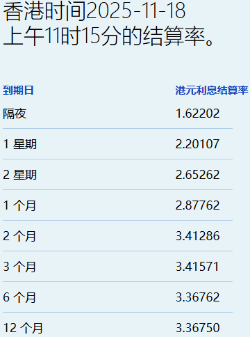 11月18日,港元拆息全线下跌,而与楼按相关的一个月拆息连跌四日,报2.87762%,跌12.667基点,兼见两个月新低;反映银行资金成本的三个月拆息报3.41571%,跌1.905基点。