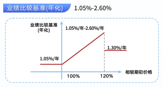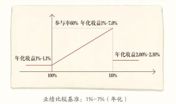 2)若观察期内挂钩标的定盘价格均低于障碍价格(即期初价格的110%),且期末价格高于或等于行权价格(即期初价格的100%),则产品的业绩比较基准为1%~7%(年化);