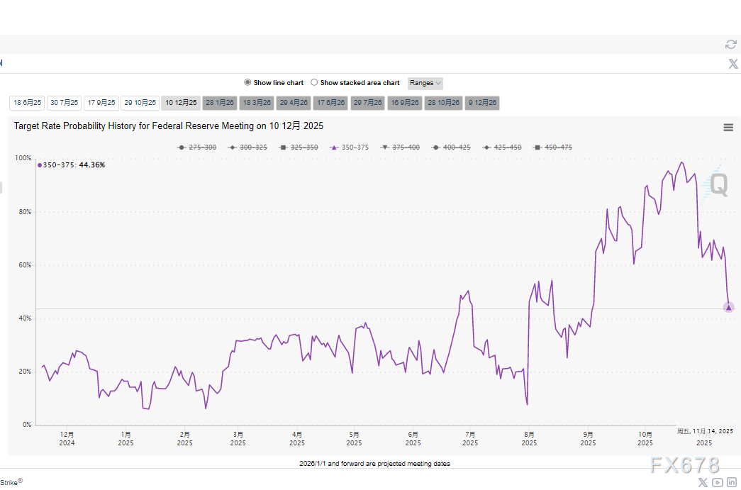 美国利率预测模型CME美联储观察工具(CMEFedWatchTool)显示,上月末市场对12月降息的预期概率仍高达90%,上周已降至60%,目前更是徘徊在45%左右。随着谨慎派声音持续发酵,投资者正逐步调整预期,越来越倾向于认为12月美联储可能维持利率不变。
