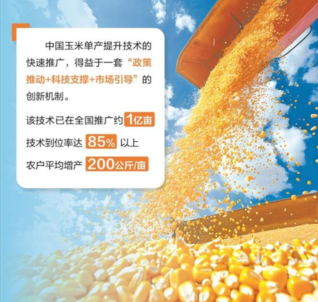 中国玉米单产提升技术的快速推广,得益于一套“政策推动+科技支撑+市场引导”的创新机制。据介绍,该技术已在全国推广约1亿亩,技术到位率达85%以上,农户平均增产200公斤/亩。