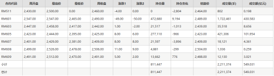 菜粕期货周度行情,各合约均有不同涨跌,品种持仓量811447手,成交量2211374手。