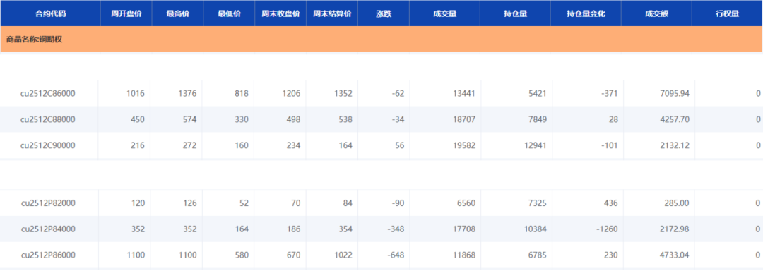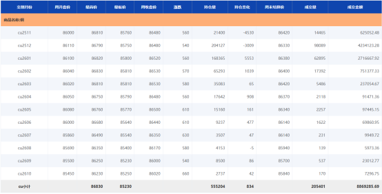 上周沪铜期货价格呈现下降走势,截至周末,主力合约沪铜2512(cu2512)周度收盘至86900点,最高价87920点,最低价85750点,持仓192293手,较上周减少约1.48万手。成交量较上周减少。
