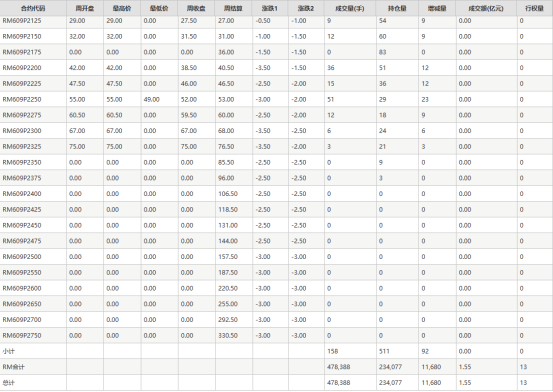 菜粕期权当周成交478388手,总持仓234077手,持仓量增加11680手,当周合计行权13手。