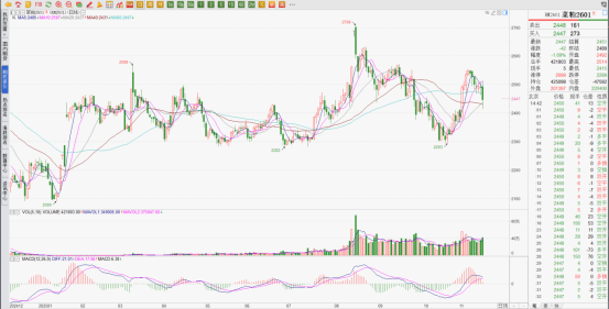 当周菜粕rm2601合约呈现震荡下行态势。截止周五,收盘价在60日均线之上5日均线之下运行,盘面60日均线有开始向下转弱迹象。