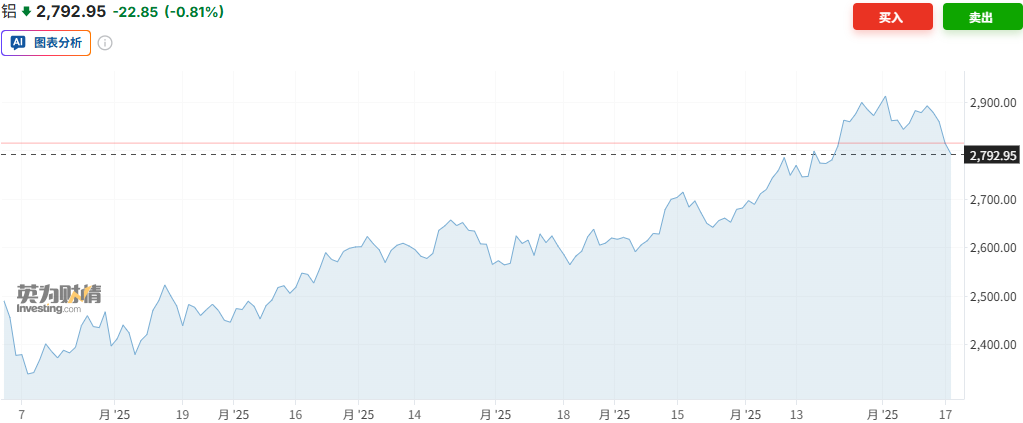 因此,叠加关税和中国产能限制的影响,全球铝业供需偏紧,近期铝价震荡骗强。当前LME铝价徘徊在2800美元/吨,持续位于2022年以来的最高点位。包括摩根士丹利、花旗资深分析师在内的华尔街分析师们普遍预计,目前的全球背景将推动全球LME铝基准价升至每吨3000美元以上。
