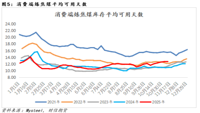 从库存角度来看,下游采购放缓,总库存延续回升,偏紧现实向略宽松转换。据Mysteel调研,消费端(钢厂自有焦化厂与独立焦化厂)炼焦煤库存平均可用天数回升至12.84天,连续5周回升,已处于近四年同期偏高水平,此背景下,下游采购意愿下降,而焦炭现货面临提降背景下,贸易商以出货为主,或加大现货下行压力。