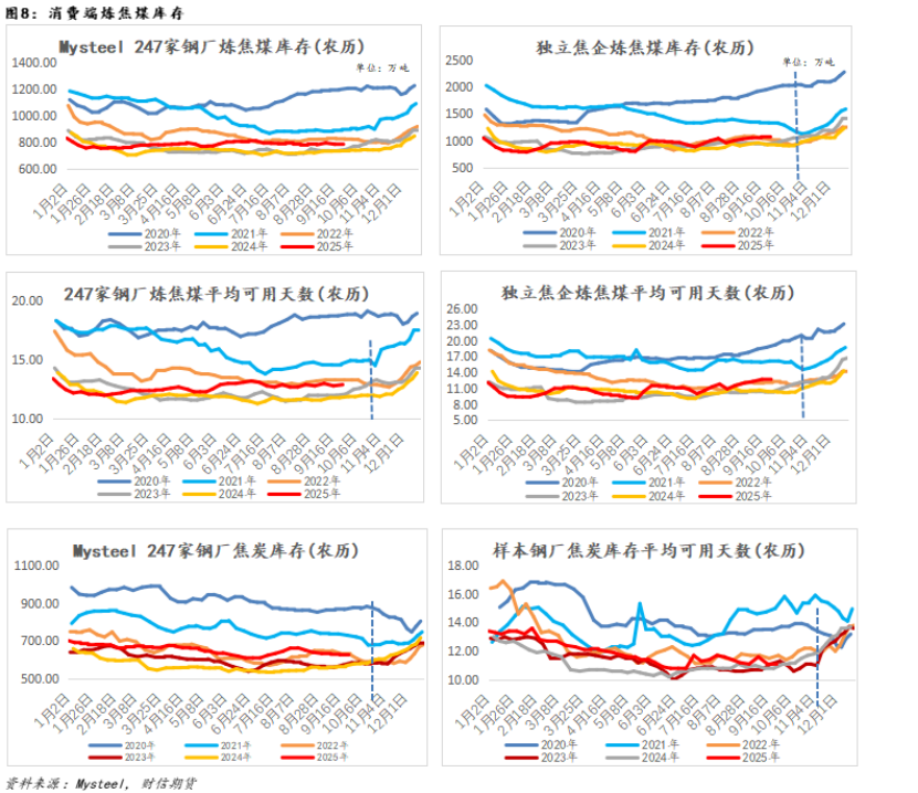 从现实角度来看,煤矿有所复产,而下游采购放缓,焦煤供增需减,总库存有所增加,焦煤现货驱动下降,铁水产量仍有进一步下降空间背景下,价格有补跌的风险。据Mysteel调研,截止11月13日,523家煤矿开工率为86.28%,环比增2.52个百分点。对比之下,受成本上升及环保扰动影响,独立焦化厂产能利用率整体处于回落态势(截至11月13日,独立焦企产能利用率为71.64%,环比下降0.67个百分点,连续五周下降)。综合供需,焦煤整体呈现供增需减态势,供需边际转弱。