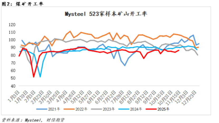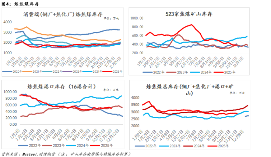 在此背景下,受“保供稳价”政策指引(现实煤矿开工呈现回升态势)及采购需求阶段性回落的影响,焦煤库存持续累积,现货价格驱动明显减弱,煤焦现货面临一定的补跌压力。